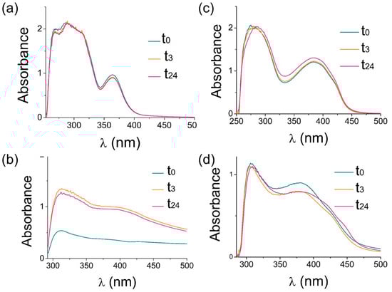 UV–Vis spectra of complex 2 (a) and 6 (c) in DMSO solution, and in phenol red-free DMEM/F12 medium in the presence of FBS (b) and (d), for 2 and 6, respectively, at 0 h (t0, green), 3 h (t3, yellow), and 24 h (t24, pink).