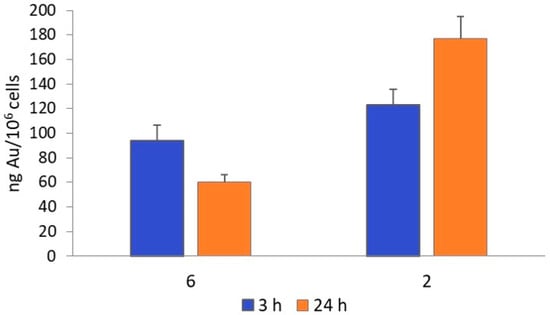 The cellular uptake of complexes 2 and 6 by the A2780 cells was assessed by PIXE after 3 h incubation at their IC50 values (80 and 20 μM, respectively), and by ICP-MS after 3 h and 24 h at their IC50 values (5 μM, 24 h) (Table 2) by measuring the total gold content (ng Au/106 cells) in the bulk A2780 cell pellets. The complexes selection was mainly based on their cytotoxic activity profile over time and their ability to overcome resistance in the A2780cisR cells. Since both complexes are very cytotoxic upon 24 h incubation it was not possible to measure the amount of gold by PIXE at this incubation time as the concentration in medium is low and the measurement of gold by PIXE approaches the minimum detection limit. Nevertheless, concentrations obtained at 3 h with PIXE in total cellular extracts (146 ± 5.4 and 51 ± 4.6 ng Au/106 cells for 2 and 6, respectively) match in amount those obtained with ICP-MS (Figure 7), in particular for complex 2, which strengthens the reliability of the measures, providing a quantitative approach to the amount of compound internalized in the cells. As can be observed from Figure 7, the uptake of complex 6 in terms of gold decreased over time, while for complex 2 an increase over the incubation time was observed. The amount of gold measured by PIXE in total cellular extracts after 6 h incubation at 10 μM showed that the uptake rate of 2 and 6 follow the same trend, although lower for 6 compared to 2 (344 ± 63 and 132 ± 16 ng Au/106 cells for 2 and 6, respectively).