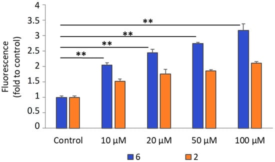 The generation of ROS was evaluated to determine any relation with the cytotoxic behavior of complexes 2 and 6. Increased levels of ROS can induce cell death by activating several signaling pathways resulting in cell apoptosis [49]. The cell-permeant 2′,7′-dichlorodihydrofluorescein diacetate (H2DCFDA) was used as a probe for ROS. Inside the cells, its oxidation to fluorescent 2′,7′-dichlorofluorescein (DCF) should be interpreted as an indication of the cellular oxidative stress. Essentially, peroxides can be detected using the H2DCFDA probe. The effect of the complexes 2 and 6 on ROS production by A2780 cells are shown in Figure 8. As can be observed the levels of ROS production upon 1 h incubation are concentration-dependent, with the complexes in the range 10–100 μM. The generation of ROS compared with the control (non-treated cells) increased ca. 3 fold at 100 μM for 6 and ca. 2 fold for 2 at the same concentration, in agreement with their cytotoxic profile. This observation is in line with the reported redox behavior, as compound 6 is the most readily reduced to the dianionic form, followed by compound 2 (Table 1).