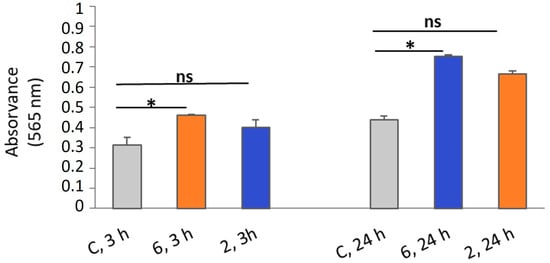 Compounds 2 and 6 stock solutions were prepared in 100% DMSO, at final concentrations of 5 mg/mL. The antibacterial susceptibility of the compounds was assessed using standard methods recommended by the European Committee on Antimicrobial Susceptibility Testing (EUCAST) for non-fastidious bacteria [56]. Final compounds concentrations tested ranged 125 µg/mL to 0.49 µg/mL, contained in the wells of 96-well microplates, in a total volume of 200 µL per well. An initial 5 × 105 CFU/mL were used for the tested bacteria. After incubation for 22 h at 37 °C, the optical density of cultures was measured at a wavelength of 640 nm as previously described [37,38].