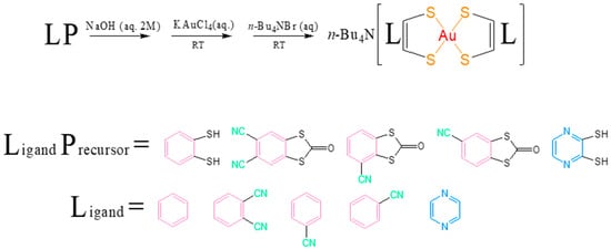 Synthetic pathway using water as the only solvent for the preparation of the tetrabutylammonium salts of [Au(bdt)2]− (1), [Au(dcbdt)2]− (2), [Au(3-cbdt)2]− (3), [Au(4-cbdt)2]− (4) and [Au(pdt)2− (5). Compound 6 was prepared as in Ref. [43].