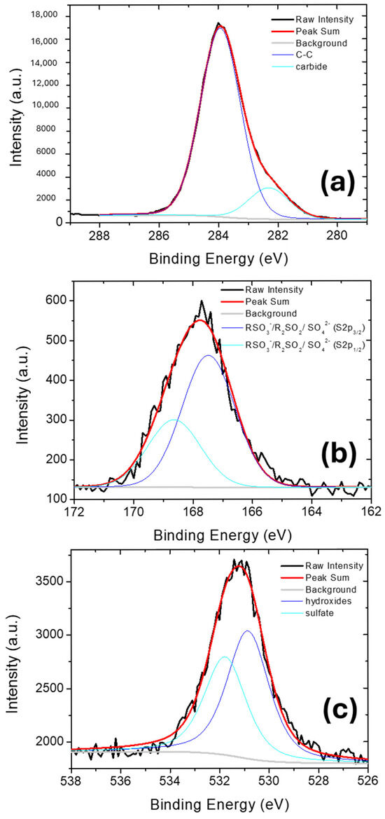 XPS spectra of C1s (a), S2p (b) and O1s (c) for Nexar film. Black continuous lines indicate the acquired spectra, red lines are the fits of the spectra, grey lines are the subtracted baselines, and the other lines are the contributions obtained by peak deconvolution.