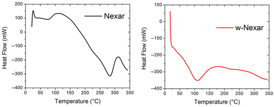 Given the importance of thermal stability for the application of Nexar films in water purification processes, the thermal behavior of both Nexar and w-Nexar (washed Nexar as described in Section 3.2) was assessed using differential scanning calorimetry (DSC) and thermogravimetric analysis (TGA) reported in Figure 2 and Figure 3, respectively.