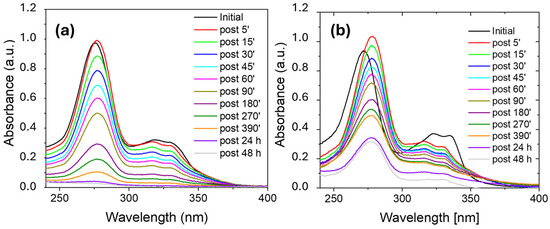 UV-visible absorbance spectra versus time obtained for Ciprofloxacin solutions prepared using MilliQ water (a) and salt water (b) where Nexar film was immersed. The initial concentration of Ciprofloxacin was 10 ppm.