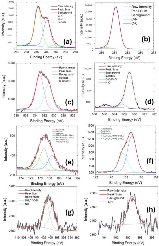 XPS spectra of C1s (a,b), O1s (c,d), S2p (e,f), and N1s (g,h) for Nexar film after adsorption in MilliQ water (on the left) and in NaCl 0.5 M (on the right) solutions. Black continuous lines indicate the acquired spectra, red lines are the fits of the spectra, grey lines are the subtracted baselines, and the other lines are the contributions obtained by peak deconvolution.
