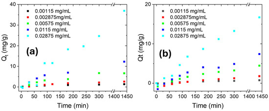 Qt values calculated as a function of time at different initial ciprofloxacin concentrations in MilliQ (a) or NaCl 0.5 M (b) solutions, respectively.