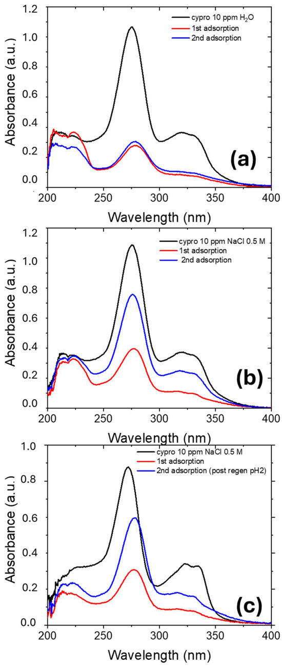 Figure 9 reports the UV-visible absorbance spectra for ciprofloxacin aqueous solutions, where a 1 cm2 piece of Nexar was immersed for the first adsorption (red curve) and the second adsorption (blue curve). The last one was performed after the regeneration process described in Section 3.5.