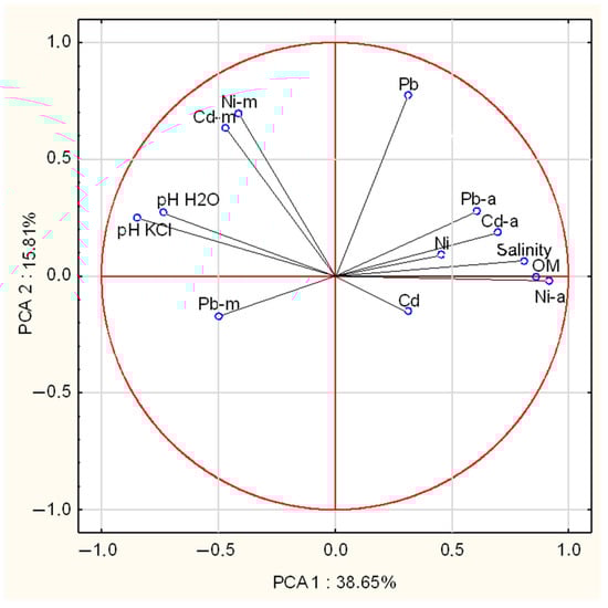 The principal component analysis (PCA) for soil and mushroom chemical composition (Cd-m—mushrooms, Cd-a—available, Cd—total, OM—organic matter).