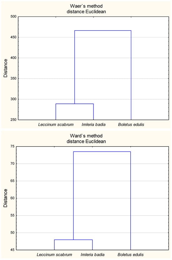 Ward’s cluster analysis for heavy metals content in soils (top) and in the mushrooms (bottom) where the mushrooms grew (L. scabrum, I. badia, B. edulis).