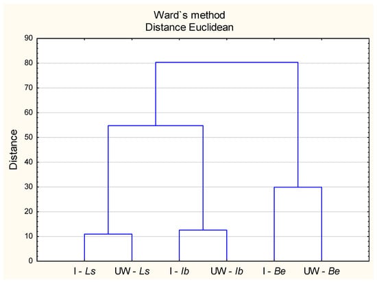 Ward’s cluster analysis of heavy metals content in mushrooms (L. scabrum, I. badia, B. edulis) with respect to their location. Explanations: I—Ls: physical-geographical region Ińsko Lake District—L. scabrum; UW—Ls: physical-geographical region of Uznam and Wolin—L. scabrum.