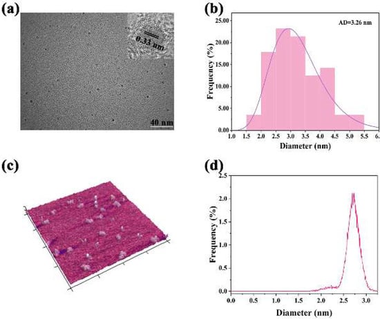Transmission electron microscopy (TEM) and high-resolution TEM (HR-TEM) were used to investigate the morphology and size of Eu-CDs. As shown in the TEM images (Figure 1a,b), the Eu-CDs exhibited good water dispersibility, a uniform spherical shape, and narrow size distribution. The average particle size, based on the measurement of 50 individual particles, was calculated to be 3.26 ± 0.36 nm. The HR-TEM image (inset of Figure 1a) revealed a distinct lattice spacing of 0.33 nm. In addition, atomic force microscopy (AFM) measurements showed that the height of Eu-CDs ranged from 1.77 to 3.25 nm, with an average thickness of 2.72 nm, corresponding to approximately 2–5 layers of stacked graphene sheets (Figure 1c,d), which was consistent with the TEM results.