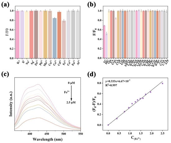 Human health disorders, including thalassemia, hemochromatosis, and thyroid dysfunction caused by excessive Fe3+ intake in food, have been linked to abnormal Fe3+ concentrations in the body. Therefore, it was important to develop a reliable and selective detection method for Fe3+ [36]. For evaluating the selectivity of Eu-CDs, the fluorescence response of the sensor was assessed against various metal ions, and common biomolecules and inorganic substances in plants. According to Figure 4a,b, a significant decrease in fluorescence intensity was observed only in the presence of Fe3+, whereas other ions caused negligible changes, indicating that Fe3+ was well selected.
