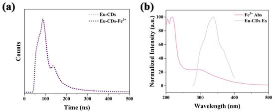(a) Lifetimes of the Eu-CDs in the absence and presence of Fe3+, (b) the excitation spectra of the Eu-CDs and the UV–vis absorption of Fe3+.