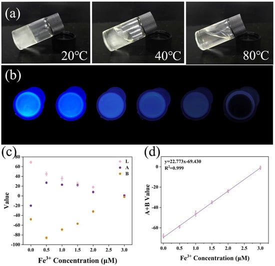 (a) Bottle test of the spontaneous degradation process of Eu-CDs@DPPGs from 20 to 80 °C, (b) photographs of Eu-CDs@DPPGs immersed in different concentrations of Fe3+, (c) relationship between LAB value and Fe3+ concentration, (d) linear relationship between A + B value and Fe3+ concentration.
