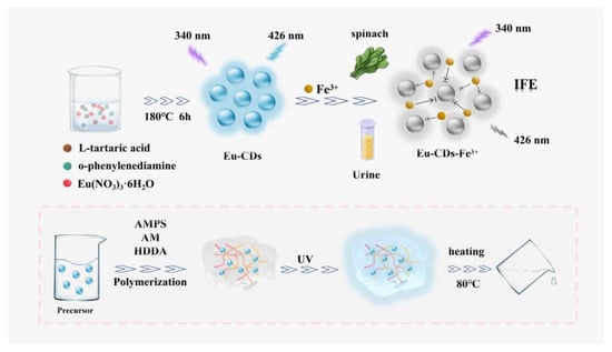 In this study, a portable and thermally degradable fluorescent hydrogel sensor for the visual detection of Fe3+ has been developed, as illustrated in Scheme 1. Using L-tartaric acid and o-phenylenediamine as carbon and nitrogen sources, respectively, and europium nitrate hexahydrate as the Eu dopant, co-doped carbon dots (Eu-CDs) were synthesized. Eu-CDs emitted strong blue fluorescence, which was significantly quenched by Fe3+ via the inner filter effect (IFE). Eu-CDs were embedded through free radical polymerization into a degradable hydrogel matrix in order to build the sensing platform. 1,6-hexanediol diacrylate (HDDA) was employed as a crosslinker, potassium persulfate (KPS) as an initiator, and acrylamide (AM), and 2-acrylamido-2-methyl-1-propanesulfonic acid (AMPS) were used as monomers. The resulting hydrogel (Eu-CDs@DPPG) was shown to allow the smartphone-assisted visual detection of Fe3+ under UV light and could be thermally degraded after use, offering a convenient and environmentally friendly sensing solution.