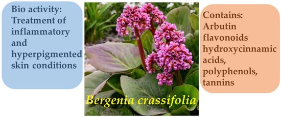 In addition, substantial concentrations of polyphenolic compounds (up to 9.27 g/100 g), tannins (up to 6.7 g/100 g), and hydroxycinnamic acids (up to 2.42 g/100 g) underscore the potential therapeutic relevance of Bergenia species in the treatment of inflammatory and hyperpigmented skin conditions. The co-presence of arbutin and other phenolic constituents suggests a possible synergistic interaction, potentially enhancing the overall dermatological efficacy of Bergenia-based formulations (Figure 2) [13,14,15].