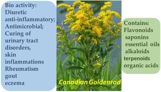 Solidago canadensis is characterized by a diverse phytochemical composition, including flavonoids, saponins, terpenoids, phenolic acids, essential oils, and alkaloids. The presence of these constituents underlies its investigated pharmacological activities—anti-inflammatory, antimicrobial, and diuretic effects [36,37]. In European traditional medicine, it has been used for over 700 years, particularly in the treatment of urinary tract disorders, skin inflammations, rheumatism, gout, and eczema. Contemporary studies confirm that S. canadensis extracts exhibit antibacterial, antiseptic, analgesic, diuretic, anti-inflammatory, and antioxidant effects (Figure 5). In particular, the plant’s essential oils have demonstrated activity against pathogenic fungi (Botrytis cinerea), Gram-positive bacteria, and Salmonella, as well as potent insect-repellent properties.