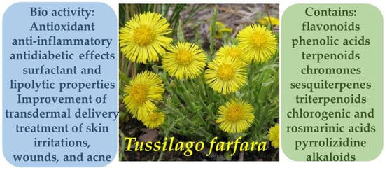 Tussilago farfara L. has long been utilized in both European and Asian traditional medicine for the treatment of dermatological and respiratory disorders. In Traditional Chinese Medicine, the floral buds (Farfarae flos) are primarily used due to their expectorant, anti-inflammatory, and soothing properties, which also extend to the treatment of skin irritations, wounds, and acne. Phytochemical studies have confirmed that the major bioactive compounds in the plant include flavonoids, phenolic acids, and sesquiterpenes—particularly tussilagone—which exhibit antioxidant, antimicrobial, and wound-healing activities. In Ayurvedic practice, the plant is also used topically for inflammatory skin conditions and to promote tissue regeneration. Recent studies suggest that T. farfara demonstrates significant anti-inflammatory effects by suppressing the expression of pro-inflammatory cytokines and inhibiting key enzymes involved in skin inflammation [44,45].