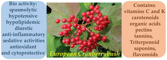 The bark of V. opulus contains tannins, triterpenoid saponins, organic acids, and flavonoids. The fruits are rich in vitamins C and K, carotenoids, organic acids, and pectins. This composition contributes to the plant’s broad therapeutic effects, including spasmolytic, hypotensive, hypolipidemic, diuretic, anti-inflammatory, and sedative activities (Figure 12) [74,75,76].