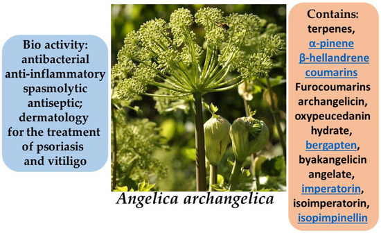 The rhizomes of A. archangelica contain essential oils rich in furanocoumarins, sesquiterpene lactones, organic acids, tannins, and flavonoids. These compounds confer antibacterial, anti-inflammatory, spasmolytic, and antiseptic properties to the plant. Studies have demonstrated that angelica extracts can inhibit inflammatory processes by suppressing key pro-inflammatory mediators such as interleukin-1β and tumor necrosis factor-alpha (TNF-α). In addition, furanocoumarins exhibit photosensitizing activity, which is therapeutically applied in dermatology for the treatment of psoriasis and vitiligo within the framework of PUVA (psoralen + UVA) therapy [82,83,84,85].