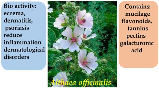 - Naseri, V.; Chavoshzadeh, Z.; Mizani, A.; Daneshfard, B.; Ghaffari, F.; Abbas-Mohammadi, M.; Naseri, M. Effect of topical marshmallow (Althaea officinalis) on atopic dermatitis in children: A pilot double-blind active-controlled clinical trial of an in-silico-analyzed phytomedicine. Phytother. Res. 2021, 35, 1389–1398. [Google Scholar] [CrossRef]