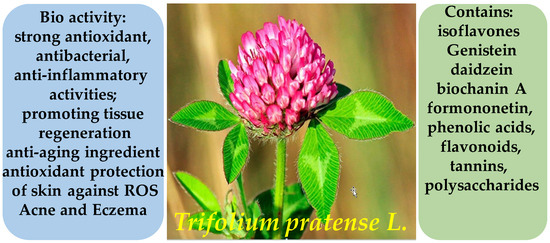 - Manzoureh, R.; Farahpour, M.R. Topical administration of hydroethanolic extract of Trifolium pratense (red clover) accelerates wound healing by apoptosis and re-epithelialization. Biotech. Histochem. 2021, 96, 276–286. [Google Scholar] [CrossRef]