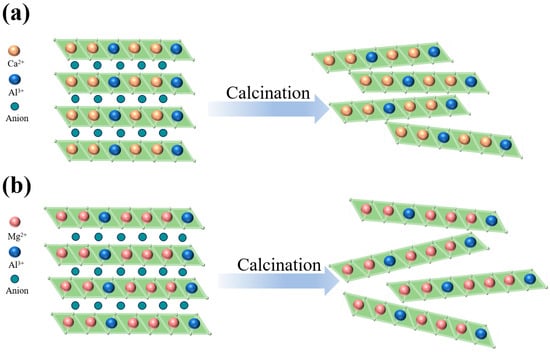 Schematic diagram of (a) Ca2Al1-LDH and (b) Mg3Al1-LDH calcination to produce LDOs.