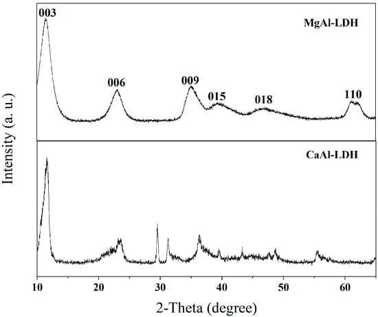 XRD characterization was performed to investigate the crystalline structure of as-synthesized MgAl-LDH and CaAl-LDH, with the diffraction patterns presented in Figure 2. The XRD analysis demonstrates that MgAl-LDH displays well-defined basal reflections at 2θ values below 30°, corresponding to the (003), (006), and (009) planes, which are characteristic of the layered double hydroxide structure. The XRD patterns exhibit well-resolved diffraction features with no observable impurity phases, confirming high phase purity. While CaAl-LDH displays marginally broader peaks due to lattice strain induced by the larger ionic radius of Ca2+ compared to Mg2+, both materials demonstrate stable baseline profiles with no evidence of CaCO3, Al2O3, or other crystalline impurities. These results indicate that synthesized MgAl-LDH and CaAl-LDH possess phase-pure composition, well-ordered layered structures, and XRD-detectable purity consistent with the structural model of LDH materials.