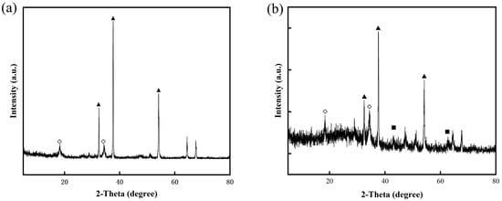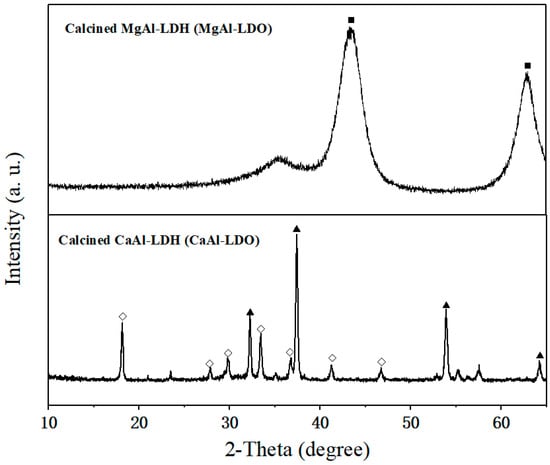 XRD curves of (a) CaO-CaAl-LDOs and (b) CaO-MgAl-LDOs; (◇) Ca12Al14O33, (▲) CaO, and (■) MgO.