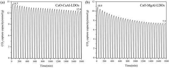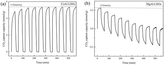 Cyclic CO2 adsorption curves of (a) CaO-CaAl-LDOs and (b) CaO-MgAl-LDOs.