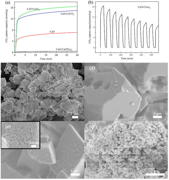 CO2 adsorption (a) saturation curves of calcium oxide prepared from different precursors, (b) cyclic CO2 adsorption curve of CaO-CaAc2, and SEM images of (c) CaO, (d) CaO-Ca(NO3)2, (e) CaO-CaCO3, and (f) CaO-CaAc2.