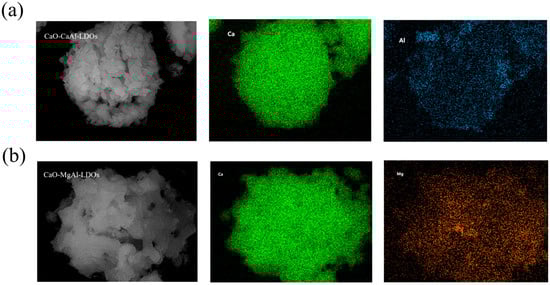 Additionally, scanning electron microscopy–energy dispersive X-ray spectroscopy (SEM-EDX) analysis (Figure 8) quantitatively confirmed the successful synthesis of CaO-dominated composites supported by hydrotalcite-derived scaffolds. In the CaAl-LDH-supported system (Figure 8a), CaO constitutes 93.68 wt% of the material, with residual aluminum (carrier element) reduced to 0.11 wt%, demonstrating near-complete coverage of the hydrotalcite framework by CaO. Similarly, the MgAl-LDH-supported composite (Figure 8b) exhibits 92.04 wt% CaO, while magnesium and aluminum (structural elements of the carrier) persist at trace levels (6.41 wt% and 1.55 wt%, respectively). These results unequivocally establish that both samples achieve >92 wt% CaO loading, a critical threshold for high-capacity CO2 capture, while further demonstrating the uniform distribution of hydrotalcite as structural stabilizers, which is essential for mitigating sintering during cyclic carbonation/calcination.