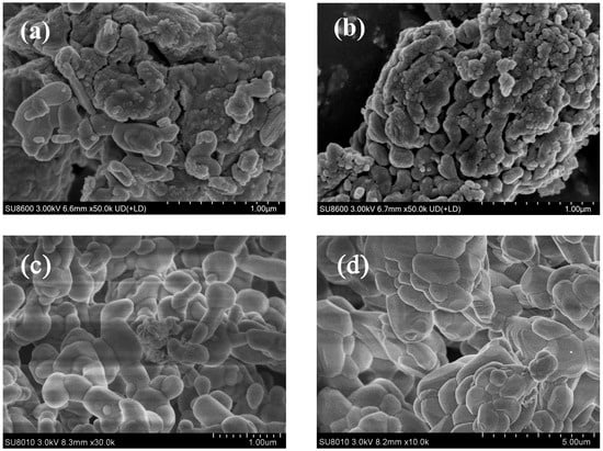 SEM images of (a) fresh CaO-CaAl-LDOs and (b) fresh CaO-MgAl-LDOs, along with their corresponding morphologies after cyclic CO2 adsorption–desorption: (c) cycled CaO-CaAl-LDOs and (d) cycled CaO-MgAl-LDOs.