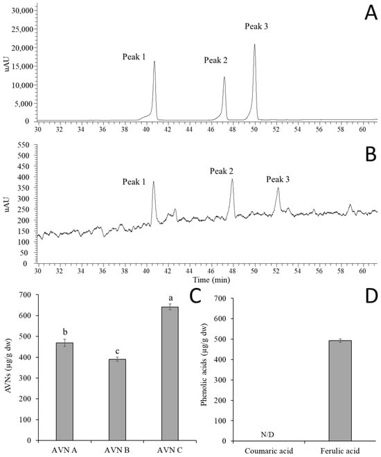 UV chromatograms of AVNs in the standard solution (A) and oat extracts (B), along with the quantification of AVNs (C) and phenolic acids (D) from the oat extracts, where peaks 1, 2, and 3 correspond to AVN C, A, and B, respectively. Data are presented as mean ± standard deviation (SD) of [n = 3] independent experiments. Statistical significance among treatment groups was determined using one-way ANOVA (or two-way ANOVA where applicable), followed by Tukey’s honestly significant difference (HSD) post hoc test. Different letters (a, b, c) above the bars indicate statistically significant differences among groups (p < 0.05). N/D means not detected, which is below the limit of detection.