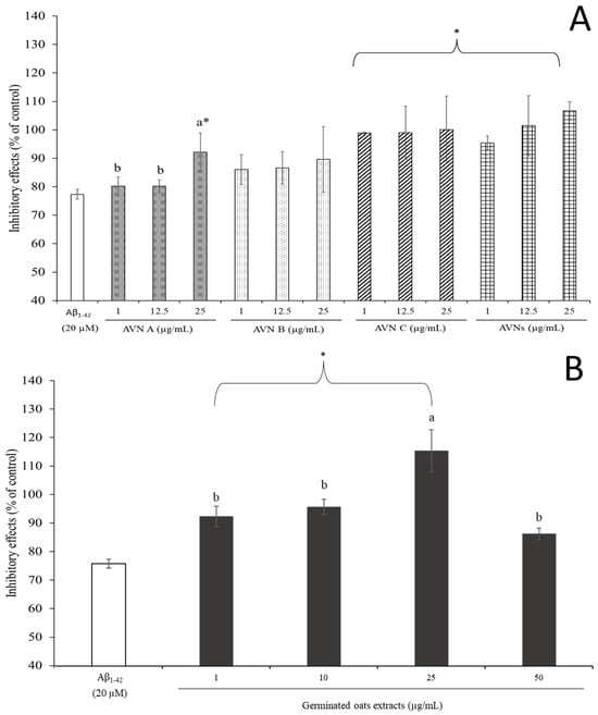 Inhibitory effects (% of control) of the AVNs (A) and oat extracts (GOEs) and (B) against Aβ1-42-induced cytotoxicity in the SH-SY5Y cell. The different letters (a, b) indicate significant differences among concentrations (p < 0.05). An asterisk (*) indicates significant differences between the Aβ1-42 and each treatment group (p < 0.05). Significant difference (HSD) post hoc test.
