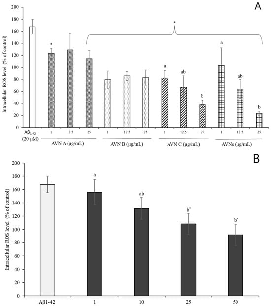 Inhibitory effect of AVNs (A) and oat extracts (GOEs) (B) on intracellular ROS production induced by Aβ1-42. The different letters (a, b) indicate significant differences among concentrations (p < 0.05). An asterisk (*) indicates significant differences between the Aβ1-42 and each treatment group (p < 0.05). Data are presented as mean ± standard deviation (SD) of [n = 3] independent experiments. Statistical significance among treatment groups was determined using one-way ANOVA (or two-way ANOVA where applicable), followed by Tukey’s honestly significant difference (HSD) post hoc test.