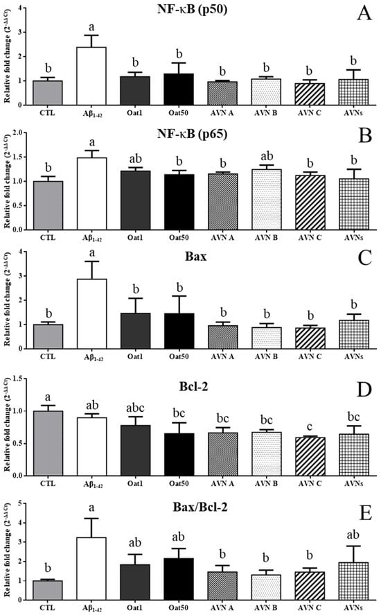 The current study evaluated the mRNA expression levels of NF-kB p50 and p65 in order to investigate biomarkers in regard to preventing the effect of AVNs and GOEs against Aβ1-42-induced neuroinflammation. The mRNA expression levels of NF-kB p50 were significantly increased to 2.38 ± 0.49 at Aβ1-42, as shown in Figure 4A. On the other hand, the AVN and GOEs treatment groups showed p50 mRNA levels of 1.17 ± 0.18 at OAT1, 1.29 ± 0.45 at OAT50, 0.97 ± 0.05 at AVN A, 1.08 ± 0.1 at AVN B, 0.89 ± 0.16 at AVN C, and 1.06 ± 0.4 at AVNs, which significantly recovered the expression levels (p < 0.05). The Aβ1-42 induced a higher p65 expression level of 1.49 ± 0.15, but OAT 1 and AVN B treatment groups tended to slightly decrease p65 mRNA levels of 1.21 ± 0.07 and 1.25 ± 0.09, respectively, which are illustrated in Figure 4B. The AVN and GOEs treatment groups showed p65 mRNA levels of 1.14 ± 0.09 at OAT50, 1.15 ± 0.04 at AVN A, 1.12 ± 0.07 at AVN C, and 1.05 ± 0.2 at AVNs, which revealed that the expression levels of these groups were significantly recovered (p < 0.05). The current study also investigated whether the expression of Bcl-2 and Bax was affected by AVN and GOEs. Aβ1-42 significantly increased the expression levels of Bax by 2.87 ± 0.73, as shown in Figure 4C. On the other hand, a significant decrease in the Bax levels of the AVN and GOEs treatment groups were observed, which showed 1.46 ± 0.62 at OAT1, 1.46 ± 0.72 at OAT50, 0.96 ± 0.15 at AVN A, 0.88 ± 0.16 at AVN B, 0.86 ± 0.11 at AVN C, and 1.18 ± 0.26 at AVNs compared to Aβ1-42, which are shown in Figure 4C. The Bcl-2 levels tended to decrease in all groups compared to CTL, 0.9 ± 0.06 at Aβ1-42, 0.78 ± 0.13 at OAT1, 0.65 ± 0.17 at OAT50, 0.67 ± 0.08 at AVN A, 0.67 ± 0.04 at AVN B, 0.59 ± 0.02 at AVN C, and 0.64 ± 0.13 at AVNs, which are displayed in Figure 4D. The ratio between Bax and Bcl-2 proteins determines the mitochondrial apoptosis pathway. The Bax/Bcl-2 ratio also significantly increased in Aβ1-42 compared to CTL, as shown in Figure 4E. The GOEs and AVNs tended to decrease compared to Aβ1-42 at 1.83 ± 0.54 at OAT1, 2.15 ± 0.52 at OAT50, and 1.94 ± 0.86 at AVNs. AVN A, AVN B, and AVN C significantly decreased compared to Aβ1-42 at 1.46 ± 0.34 at AVN A, 1.31 ± 0.25 at AVN B, and 1.46 ± 0.21 at AVN C.