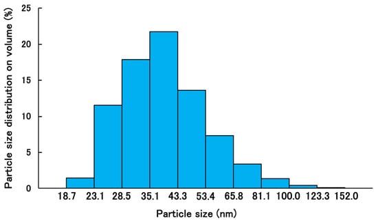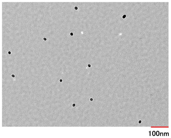 The mean volume diameter, the loading capacity, the entrapment efficiency, the PDI, and the ζ-potential of PSL-loaded PLGA-PEG-PLGA NPs were 45.8 ± 16.5 nm, 1.4%, 24%, 0.147, and −3.98 ± 2.43 mV, respectively. The particle size distribution and TEM images of PSL-loaded PLGA-PEG-PLGA nanoparticles are shown in Figure 1 and Figure 2. When the 11 nanoparticles in Figure 1 were measured using Image J (Ver. 1.54p) [29], the particle diameter was 27.9 ± 3.5 nm. PSL-loaded PLGA-PEG-PLGA nanoparticles were spherical and dispersed without agglomeration.
