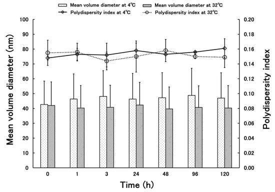 The observation conditions were 100 kV of acceleration voltage and 20,000× magnification. To confirm the stability of these PSL-loaded PLGA-PEG-PLGA NPs, the mean volume diameters and polydispersity index of these NPs were measured in the same manner as described in Section 4.3.1. The storage stability of the PSL-loaded PLGA-PEG-PLGA NPs prepared in this study was confirmed by storing them at 4 and 32 °C for five days. A temperature of 32 °C was derived from the surface temperature of the human body’s skin [24]. After 1, 3, 24, 48, 96, and 120 h, the samples were taken, and mean volume diameters and PDIs were measured using ELSZneo. To evaluate the release properties of PSL-loaded PLGA-PEG-PLGA NPs used in this study, 3 mL of PSL-loaded PLGA-PEG-PLGA NPs prepared in Section 2.2 was placed in a dialysis membrane (UC20-32, molecular weight cut off: 14,000, Sekisui Material Solutions Co., Ltd., Tokyo, Japan) and placed in a vial with 97 mL of purified water at 32 °C for 24 h with water bath shaking [39]. After 0.5, 1, 2, 3, 6, 8, 12, and 24 h, each of the 3 mL samples of the outer solution were extracted and measured using HPLC, and the release rate was calculated. The same volume of purified water was added when the outer solution was extracted, and the total volume of the outer solution was always kept at 97 mL.