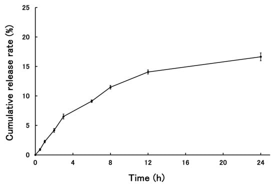 The release behavior of PSL from PSL-loaded PLGA-PEG-PLGA NPs is shown in Figure 4. The cumulative release rate of PSL from the nanoparticles 24 h after the start of the release test was 18.94 ± 0.73%. The release of PSL from NPs plateaued after 24 h. Data were collected up to 48 h, but since the skin was removed after 24 h and cytokine measurements were performed, only data up to 24 h are shown here.