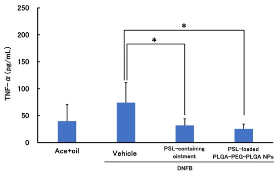 TNF-α levels in a mouse model of acute allergic contact dermatitis (n = 5, mean ± S.D. * p < 0.05 vs. DNFB, Tukey–Kramer’s test).