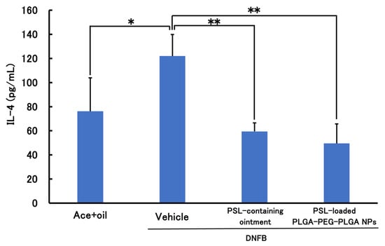 Figure 5 and Figure 6 show the results of the therapeutic effect of PSL-loaded PLGA-PEG-PLGA NPs on ACD when administered 2 h before sensitization. In TNF-α, a significant decrease was observed in the PSL-loaded PLGA-PEG-PLGA NPs and PSL-containing ointment groups compared to the untreated group. In IL-4, a significant decrease was observed in all groups compared to the untreated group. There were no significant differences in either TNF-a or IL-4 between the PSL-loaded PLGA-PEG-PLGA NP group and the PSL-containing ointment group.