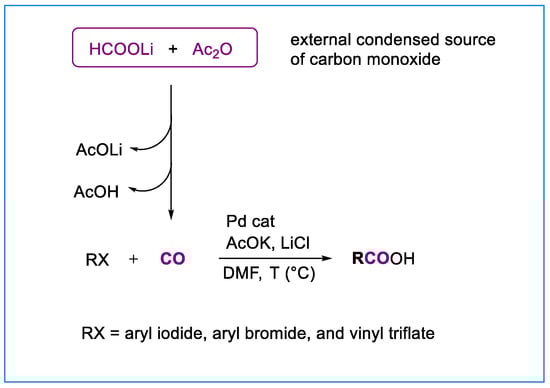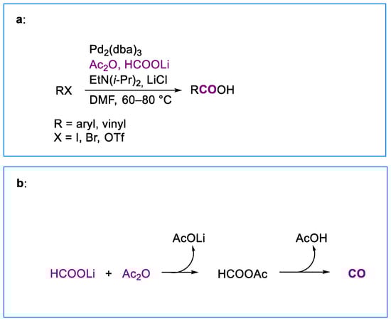 In this context, we showed that the palladium-catalyzed hydroxycarbonylation of aryl and vinyl halides or triflates can be conveniently carried out in the presence of formate salts and acetic anhydride under the conditions displayed in Scheme 1a, omitting phosphine ligands [14,15,16]. Furthermore, the procedure for synthesizing benzoic acids from aryl bromides using our source of carbon monoxide has been improved [17].