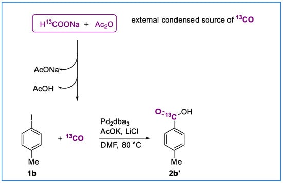 Despite their significant value, the synthesis of 13C-labeled carboxylic acids remains challenging due to the limited availability of labeled reagents, the high cost of isotopes, and the operational complexity associated with their incorporation, particularly when 13CO is required. To overcome these limitations, we employed commercially available H13COONa in combination with acetic anhydride. Under our optimized hydroxycarbonylation conditions, p-iodotoluene was converted to 13C-labeled p-toluic acid 2b’ in 60% yield via in situ generation of 13CO through the formation and thermal decomposition of 13C-acetic formic anhydride (Scheme 3).