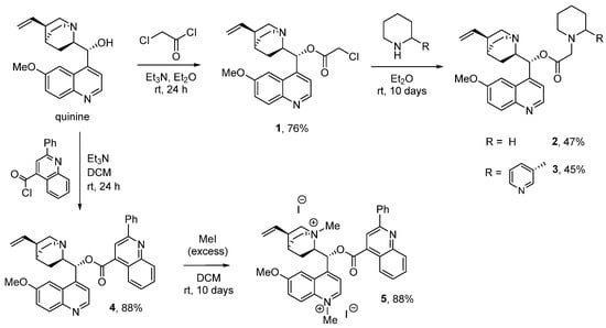 Cinchophene ester 4 was obtained by the acylation of quinine with cinchophen acid chloride in methylene chloride in the presence of triethylamine in an 88% yield. When compound 4 was kept in methylene chloride in the presence of excess methyl iodide, iodomethylate 5 was obtained in an 88% yield (Scheme 1).