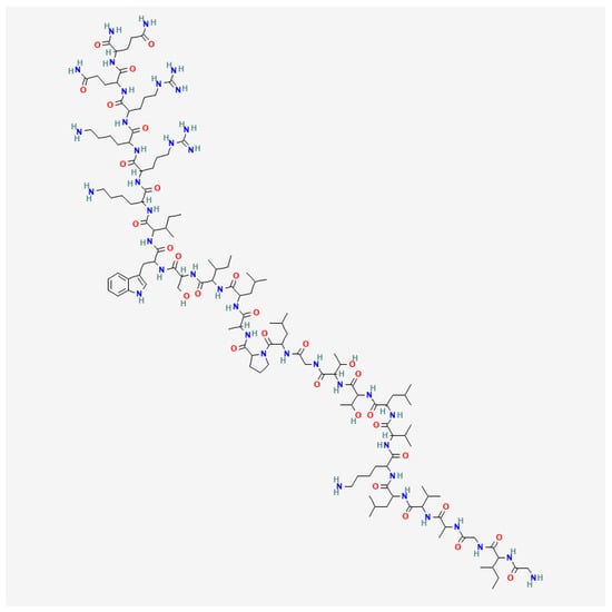 The main component of apitoxin is the polypeptide melittin, which represents approximately 40–50% of the dry weight of the venom [14]. It is a water-soluble, amphipathic linear polypeptide consisting of 26 amino acids, with a molecular weight of 2840 Da and the chemical formula C131H229N39O31 (Figure 1) [11].