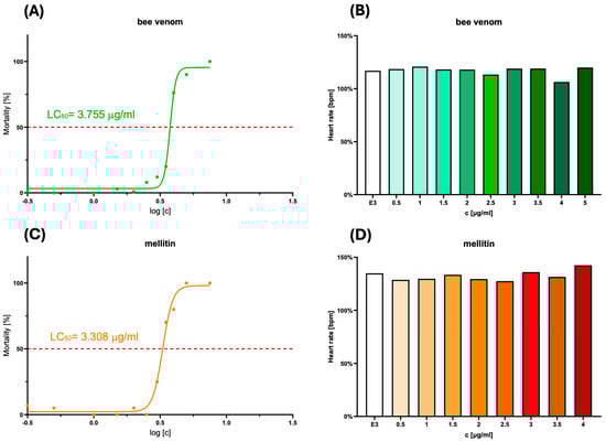 The mortality of zebrafish exposed to different concentrations of BV (A) and melittin (C). The percentage of zebrafish mortality (y-axis) as a function of the logarithm of the drug concentration (x-axis). The red dashed line represents the 50% viability, which is used to determine the LC50 (Lethal Concentration 50) value for each compound. The LC50 value is the concentration at which 50% of the zebrafish larvae are expected to die. The right side of the figure indicates the lack of cardiotoxicity of the bee venom (B) and melittin (D) concentrations used. The mean heart rate did not change significantly.