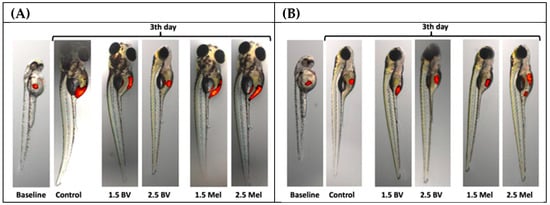 Representative images of glioblastoma cells’ xenotransplantation into zebrafish embryos. Microscopic observation of the 8MGBA cells (A) and LN-229 cells (B) at 5 dpf zebrafish xenograft upon treatment with BV and melittin (Mel) (1.5 µg/mL and 2.5 µg/mL) vs. control zebrafish embryos xenotransplanted with glioblastoma cells and incubated without BV or Mel.