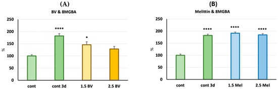 Bar graphs representing the percentage of 8MGBA cells xenotransplanted into zebrafish embryos treated for 72 h with BV (A) or melittin (B) at the concentrations of 1.5 µg/mL and 2.5 µg/mL for each compound, or without any treatment (cont 3d). Initial measurement of cell percentage before treatment was set to 100% (cont). Mean (SEM), * p < 0.05, **** p < 0.0001 compared to control.