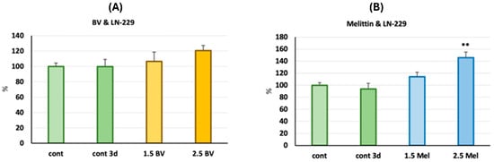 Bar graphs representing the percentage of LN-229 cells xenotransplanted into zebrafish embryos treated for 72 h with BV (A) or melittin (B) at the concentrations of 1.5 µg/mL and 2.5 µg/mL for each compound, or without any treatment (cont 3d). Initial measurement of cell percentage before treatment was set to 100% (cont). Mean (SEM), ** p < 0.001 compared to control.
